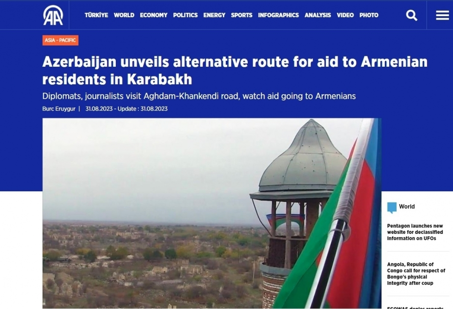 Anadolu Agency has published an article headlined “Azerbaijan unveils alternative route for aid to Armenian residents in Karabakh”.