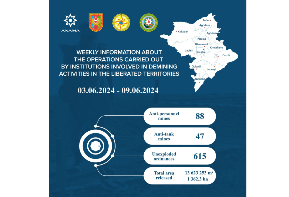 “During the mine-clearing operations in the Tartar, Aghdara, Kalbajar, Aghdam, Khojaly, Khankendi, Khojavand, Lachin, Shusha, Fuzuli, Gubadli, Jabrayil and Zangilan districts 88 anti-personnel and 47 anti-tank mines, as well as 615 unexploded ordnances (UXOs) were found and neutralized from June 3 to 9,” Azerbaijan’s Mine Action Agency said in a statement.