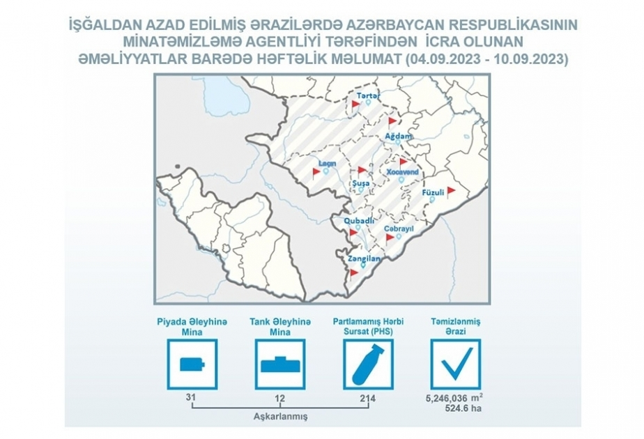 “During the mine-clearing operations in Tartar, Aghdam, Khojavand, Lachin, Shusha, Fuzuli, Gubadli, Jabrayil and Zangilan districts 31 anti-personnel and 12 anti-tank mines, as well as 214 unexploded ordnances (UXOs) were found and neutralized from September 4 to 10,” Azerbaijan’s Mine Action Agency said in a statement.