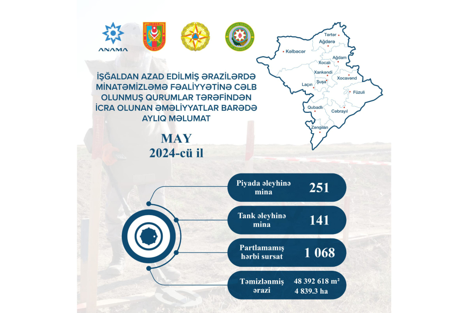 “During the mine-clearing operations in Tartar, Aghdara, Kalbajar, Aghdam, Khojaly, Khankendi, Khojavand, Lachin, Shusha, Fuzuli, Gubadli, Jabrayil and Zangilan districts 251 anti-personnel and 141 anti-tank mines, as well as 1,068 unexploded ordnances (UXOs) were found and neutralized from May 1 to 31,” Azerbaijan’s Mine Action Agency said in a statement.