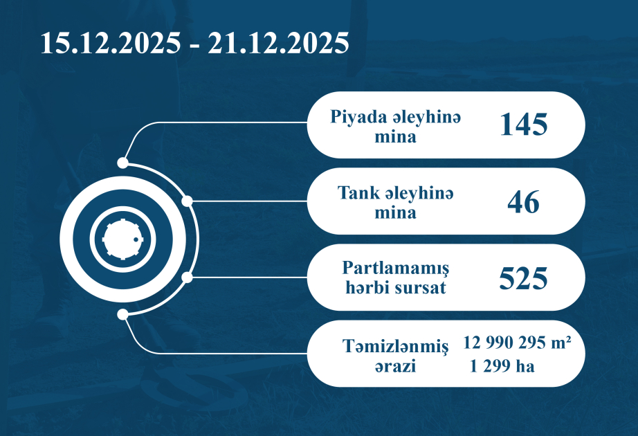 From December 15 to 21, the Azerbaijan Mine Action Agency (ANAMA) conducted mine-clearance operations in the districts of Tartar, Aghdara, Kalbajar, Aghdam, Khojaly, Khankendi, Khojavend, Lachin, Shusha, Fuzuli, Gubadli, Jabrayil, and Zangilan.