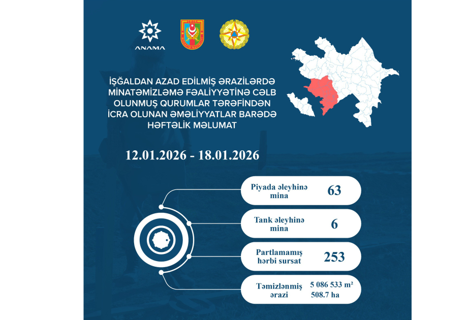 From January 12 to 18, the Azerbaijan Mine Action Agency (ANAMA) carried out mine-clearance operations in the districts of Tartar, Aghdara, Kalbajar, Aghdam, Khojaly, Khankendi, Khojavend, Lachin, Shusha, Fuzuli, Gubadli, Jabrayil, and Zangilan.
