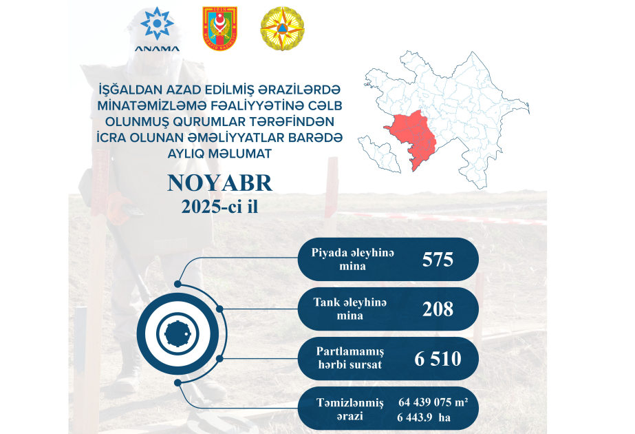 The Azerbaijan Mine Action Agency (ANAMA) conducted demining operations in Tartar, Aghdara, Kalbajar, Aghdam, Khojaly, Khankendi, Khojavend, Lachin, Shusha, Fuzuli, Gubadli, Jabrayil, and Zangilan districts in November.