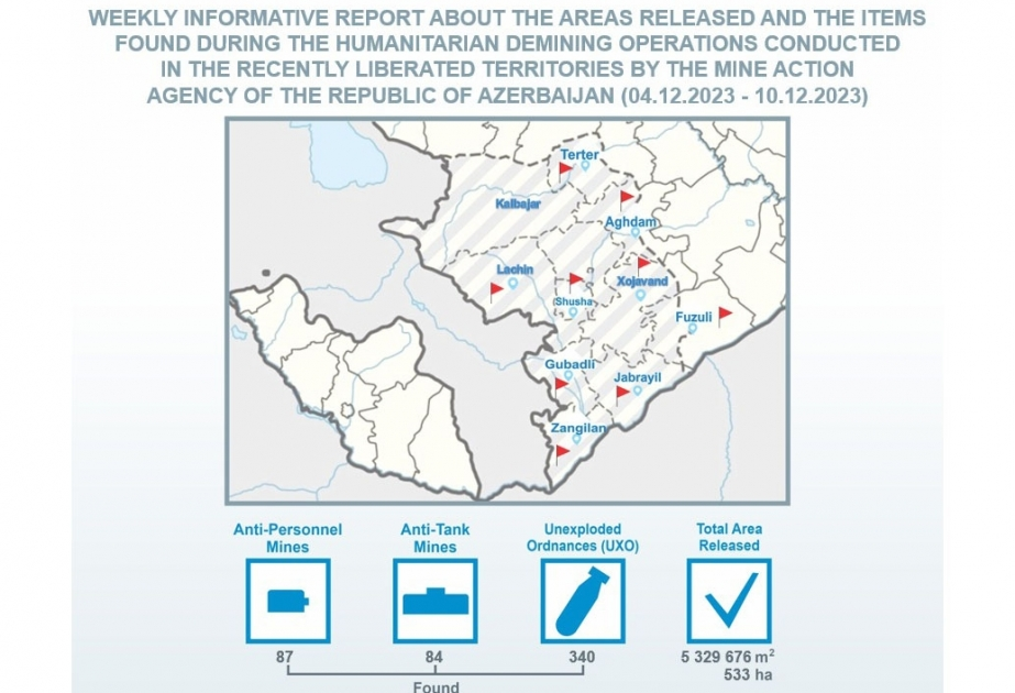 “In the course of mine-clearing operations conducted across the Tartar, Kalbajar, Aghdam, Lachin, Khojavand, Shusha, Fuzuli, Gubadli, Jabrayil and Zangilan districts, 87 anti-personnel, 84 anti-tank mines, and 340 unexploded ordnances (UXOs) were found and neutralized from December 4 to 10,” Azerbaijan’s Mine Action Agency said in a statement.