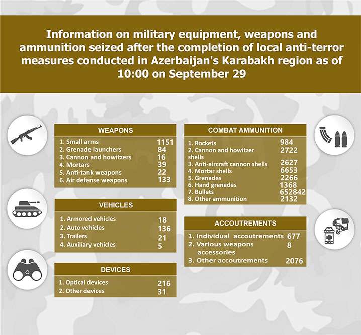Information on military equipment, weapons and ammunition seized after the completion of local anti-terror measures conducted in Azerbaijan’s Karabakh region as of 10:00 on September 29.