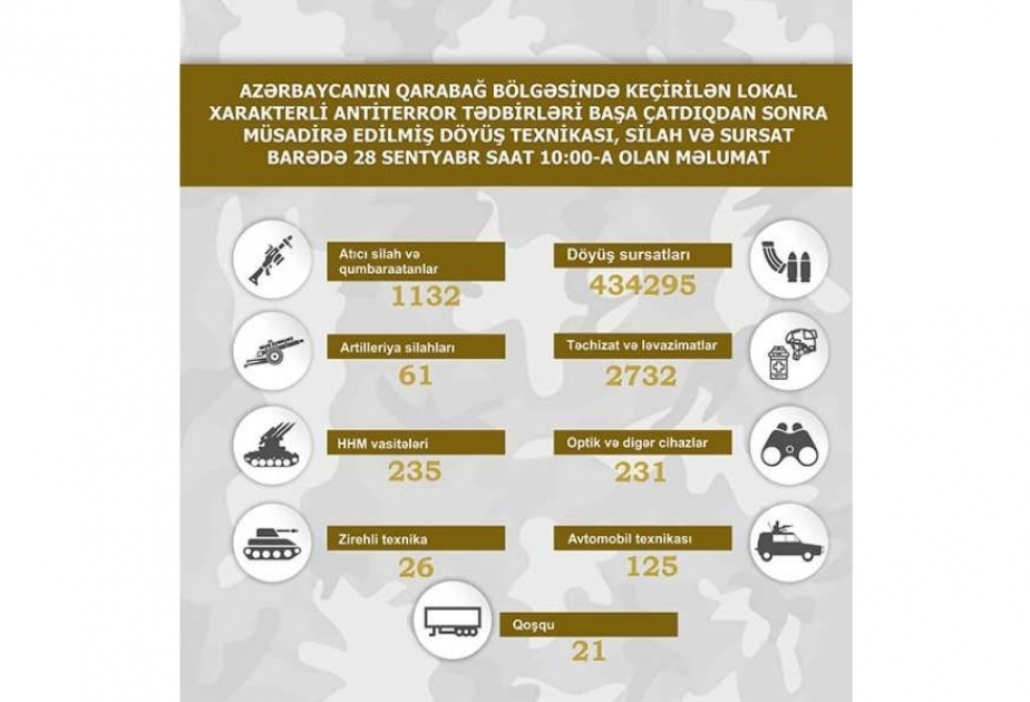 Information on military equipment, weapons and ammunition seized after the completion of local anti-terror measures conducted in Azerbaijan’s Karabakh region as of 10:00 on September 28.