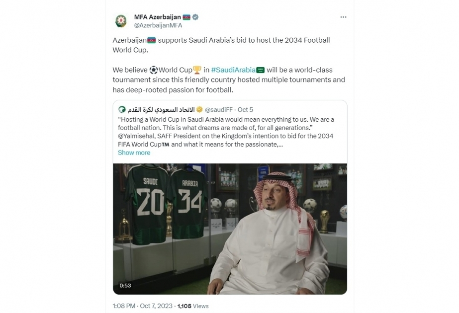“Azerbaijan supports brotherly Saudi Arabia’s bid to host the 2034 Football World Cup,” Azerbaijan’s Ministry of Foreign Affairs said on X platform.