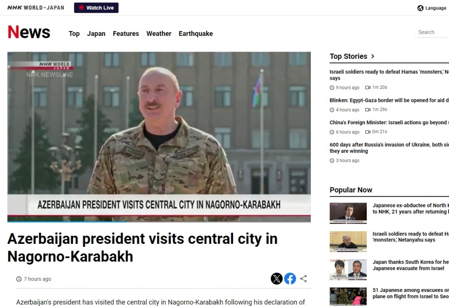 Japan’s popular NHK TV channel has broadcast a reportage highlighting President of Azerbaijan Ilham Aliyev’s visit to the city of Khankendi.