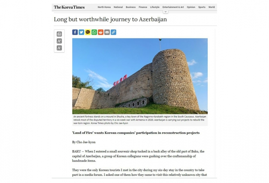Participant of the Shusha Global Media Forum from South Korea Cho Jae-hyon has published an article in the “The Korea Times” newspaper highlighting the restoration and construction works carried out by the Azerbaijani state in the liberated Karabakh and Eastern Zangezur, as well as the tourism potential of Azerbaijan.
