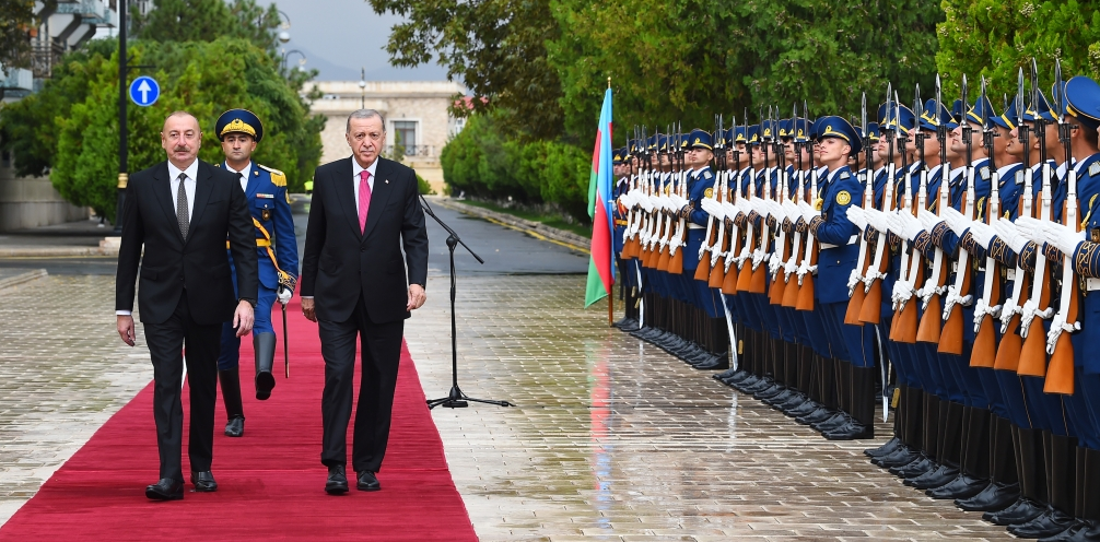 Presidents Ilham Aliyev and Recep Tayyip Erdogan reviewed the guard of honor.