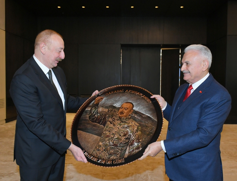 Binali Yıldırım, the Chairman of Council of Elders of the Organization of Turkic States, presented a keepsake to President of the Republic of Azerbaijan Ilham Aliyev.