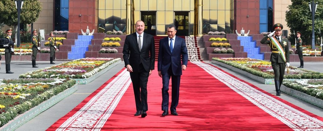 A guard of honor was lined up for the Azerbaijani President at Dushanbe International Airport.