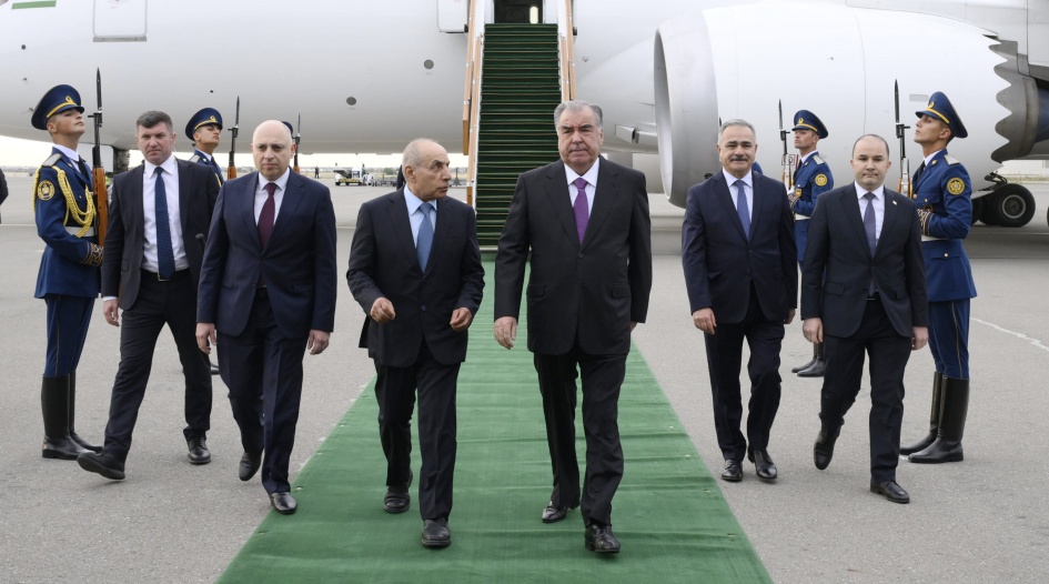President of Tajikistan Emomali Rahmon was welcomed by First Deputy Prime Minister of Azerbaijan Yagub Eyyubov, Deputy Foreign Minister Samir Sharifov, and other officials.