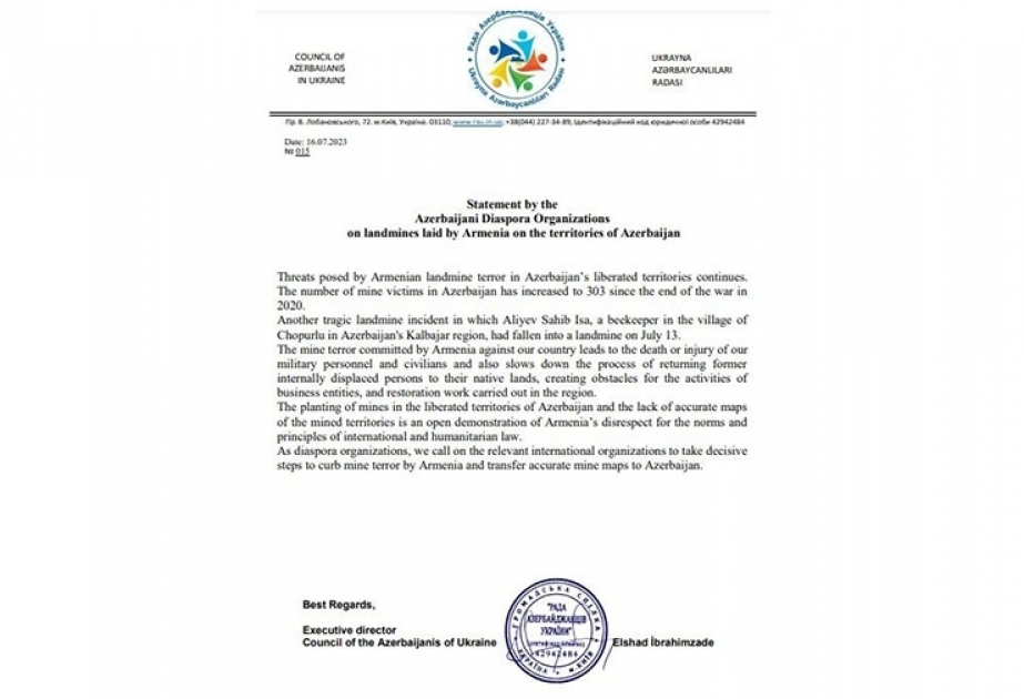 As diaspora organizations, we call on the relevant international organizations to take decisive steps to curb mine terror by Armenia and transfer accurate mine maps to Azerbaijan.”