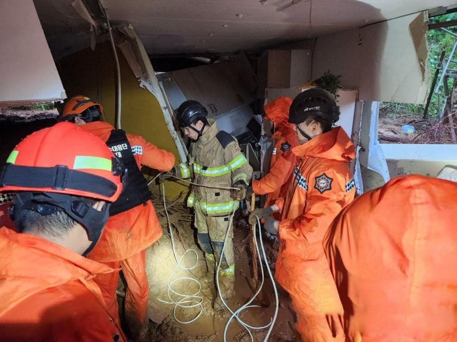 One person was killed in a mudslide in the central city of Sejong and housing collapses killed three people in the southeastern county of Yeongju and the central county of Cheongyang.