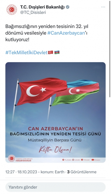 A number of Turkish state institutions and officials congratulated Azerbaijan on October 18 – the Day of Restoration of Independence on their official X platform.
