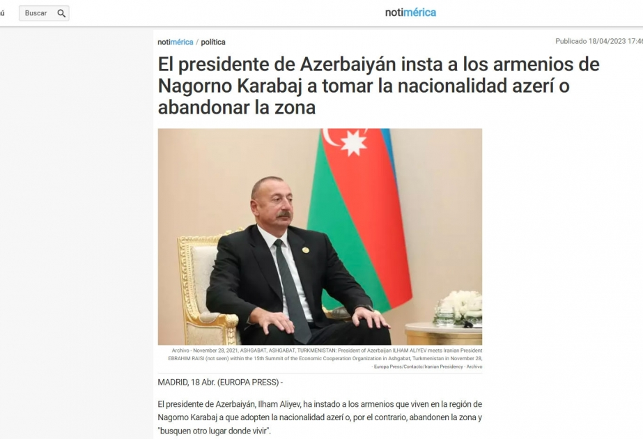 Avropanın bir sıra ölkələrinin KİV-ləri də Prezident İlham Əliyevin Azərbaycan Televiziyasına müsahibəsində söylədiyi fikirləri geniş işıqlandırıb. İspan dilində yayımlanan “Europapress”, “La Nacion”, “Cope”, “Diariosigloxxi”, “Grupolaprovincia”, “Teleprensa”, “Notimerica”, Macarıstanın “Demokrata.hu”, “Hirado”, “Portfolio” saytları, həmçinin Bolqarıstanın “Focus-news”, “Actualno”, Moldovanın “Timpul” kimi media qurumları Azərbaycan Prezidentinin “Biz dəfələrlə bəyan etmişdik ki, daxili işlərimizi heç bir ölkə ilə müzakirə etməyəcəyik. Qarabağ bizim daxili işimizdir. Qarabağda yaşayan ermənilər ya Azərbaycan vətəndaşlığını qəbul etməlidirlər, ya da ki, özləri üçün başqa yaşayış yeri tapmalıdırlar” bu fikirlərini xüsusi vurğulayıb. Oxucuların diqqətinə çatdırılıb ki, Prezident İlham Əliyev burada tam sərbəstliyin olduğunu, bütün demokratik əsasların təklif edildiyini, bu məsələnin insan hüquqları əsasında öz həllini tapmasının vacibliyini bildirib.
