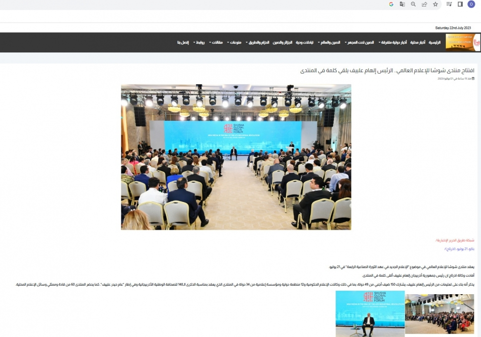 “Belbaladi” və “Əl Hərir” informasiya portallarında AZƏRTAC-ın xəbərinə istinadla dərc olunan materiallarda qeyd edilib ki, Forumda çıxış edən Azərbaycan Prezidenti İlham Əliyev medianın insanların maarifləndirilməsi və onların problemlərinin həllində mühüm rol oynadığını söyləyib. Azərbaycanın dövlət başçısı, həmçinin ənənəvi media ilə yanaşı, sosial medianın da mühüm rolunu qeyd edib.