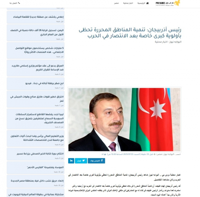 Misirin MENA xəbər agentliyinin saytında və nüfuzlu “Əl Əhram” qəzetində “Prezident İlham Əliyev işğaldan azad olunmuş ərazilərin inkişafının prioritet məsələ olduğunu bildirib” sərlövhəli məqalə dərc edilib. Yazıda diqqətə çatdırılıb ki, Şuşa Qlobal Media Forumunda iştirak edən dünyanın müxtəlif ölkələrindən gəlmiş jurnalistlərin suallarını cavablandıran Azərbaycanın dövlət başçısı uzun illər işğaldan əziyyət çəkən ölkəsinin sülhə və inkişafa nail olmaq istədiyini bildirib.