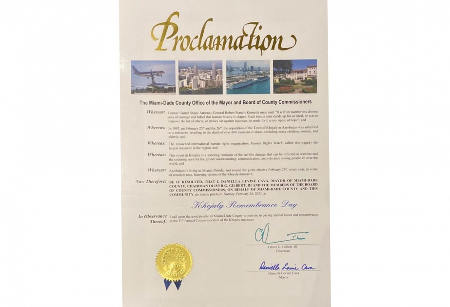 ABŞ-ın Mayami-Deyd dairəsində 26 fevral 2023-cü il tarixi Xocalının Anım Günü kimi elan edilib.