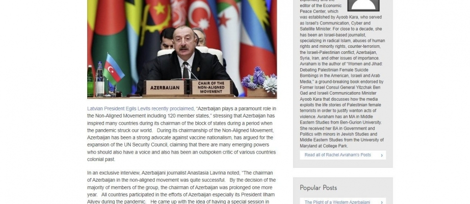 Diasporla İş üzrə Dövlət Komitəsindən verilən məlumata görə, tanınmış israilli politoloq və jurnalist, Dona Qrasiya Diplomatiya Mərkəzinin təsisçisi və baş direktoru Reyçel Avrahamın qələmə aldığı məqalədə Latviya prezidenti Eqlits Levitsə istinadən bildirilib ki, 120 üzv dövləti özündə birləşdirən Qoşulmama Hərəkatında mühüm rol oynayan Azərbaycan pandemiyanın tüğyan etdiyi bir vaxtda sözügedən dövlətlər blokuna sədrliyi dövründə bir çox ölkələri adıçəkilən fəlakətlə mübarizəyə ruhlandırıb, fəal şəkildə peyvənd diskriminasiyasına qarşı çıxıb, hazırkı beynəlxalq münasibətlərdə bir sıra yeni güclərin söz sahibi olmasının labüdlüyünü nəzərə alaraq BMT Təhlükəsizlik Şurasının genişlənməsi ideyasını müdafiə edib və ya müxtəlif ölkələrin müstəmləkəçi keçmişini açıq şəkildə tənqid edib.