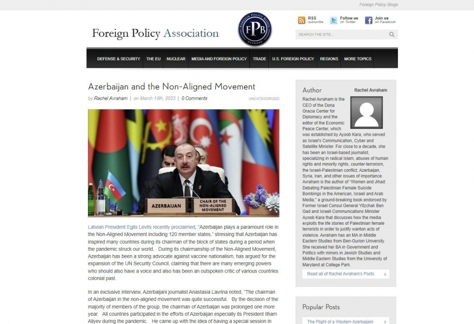Baş qərargahı ABŞ-ın Nyu-York şəhərində yerləşən Xarici Siyasət Assosiasiyasının xəbər saytında “Azərbaycan və Qoşulmama Hərəkatı” sərlövhəli məqalə dərc olunub.