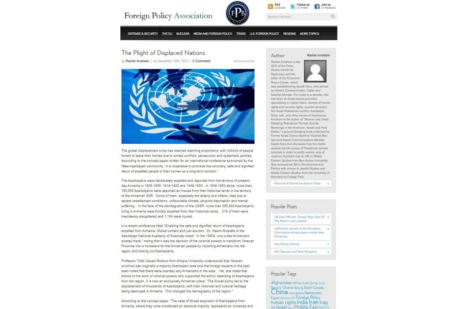ABŞ-ın Xarici Siyasət Assosiasiyasının xəbər saytında “Köçkün xalqların acınacaqlı vəziyyəti” sərlövhəli məqalə dərc olunub.