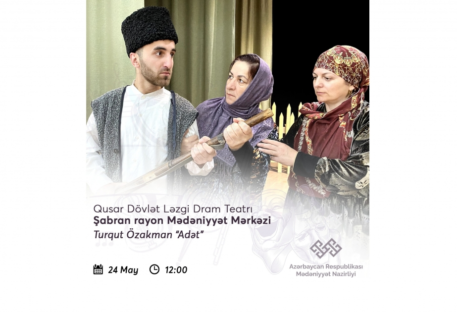 Qusar Dövlət Ləzgi Dram Teatrının kollektivi mayın 24-də Şabran rayon Mədəniyyət Mərkəzində Turqut Özakmanın “Adət” tamaşasını nümayiş etdirəcək.