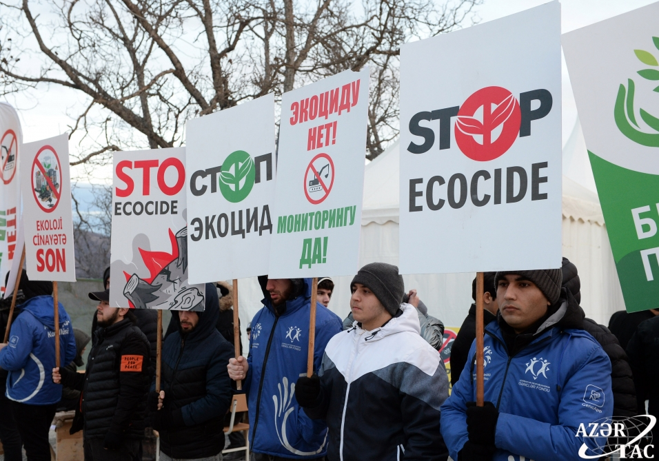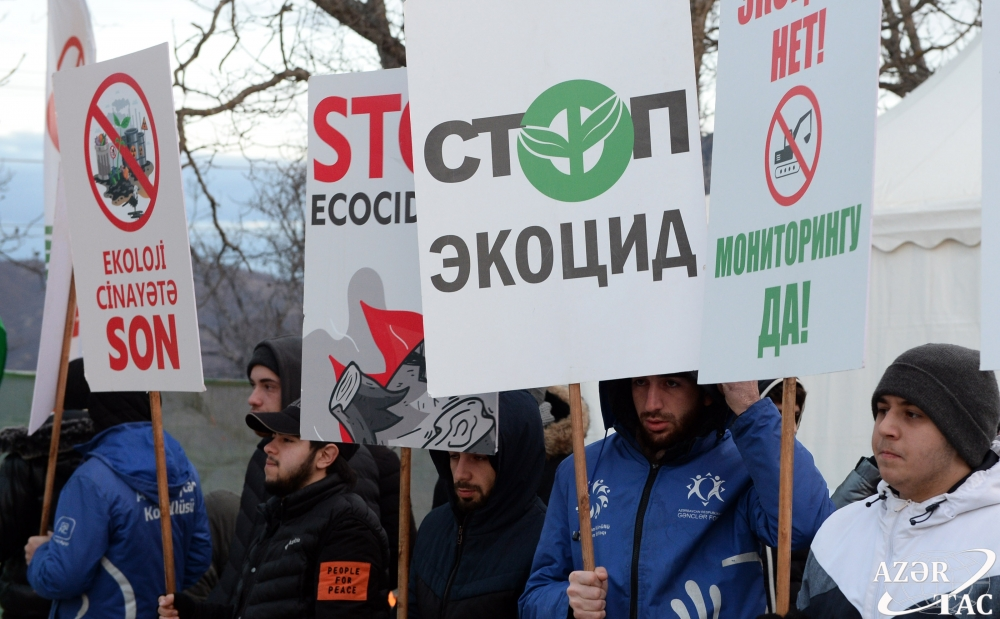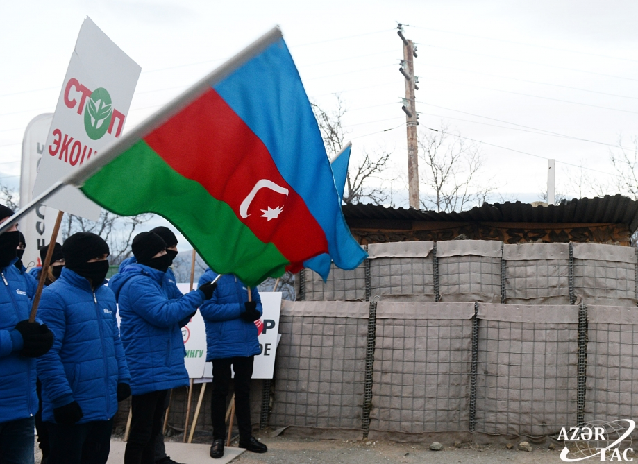 Qeyd edək ki, aksiya iştirakçıları Qarabağda faydalı qazıntı yataqlarının qanunsuz istismarına etirazlarının əks olunduğu plakatlar qaldırır, “Azərbaycan oyaqdır, sərvətlərə dayaqdır”, “Ekoloji cinayətə son!”, “Azərbaycan milləti qoruyacaq sərvəti” kimi şüarlar səsləndirirlər.