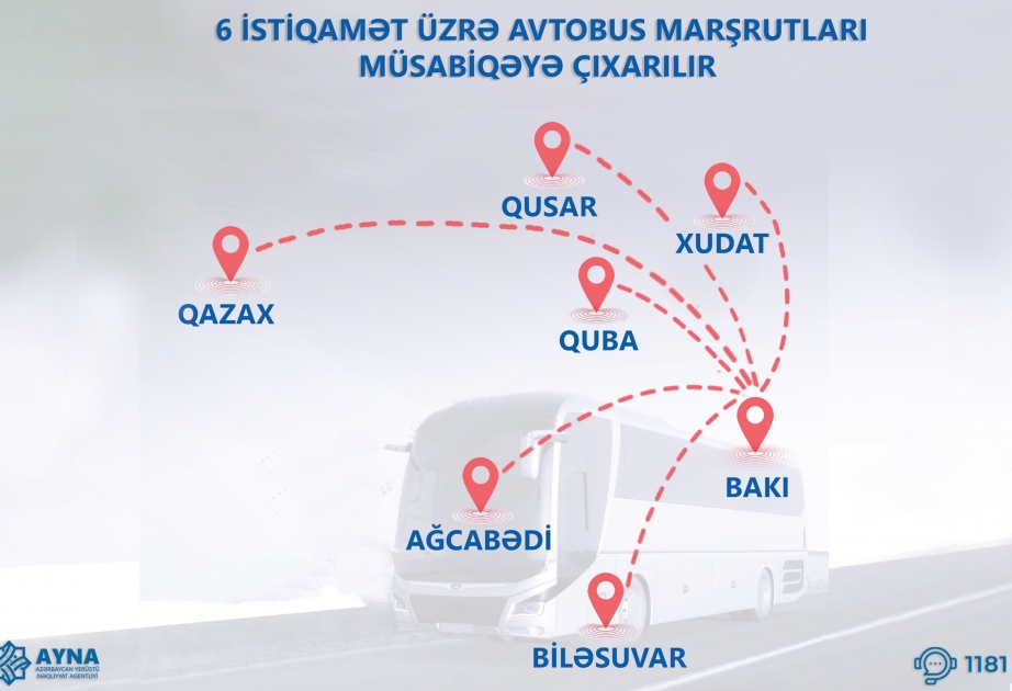 Azərbaycan Yerüstü Nəqliyyat Agentliyi (AYNA) şəhərlərarası sərnişindaşıma xidmətinin keyfiyyətinin artırılması ilə bağlı tədbirlər çərçivəsində Bakı-Qazax-Bakı, Bakı-Ağcabədi-Bakı, Bakı-Biləsuvar-Bakı, Bakı-Quba-Bakı, Bakı-Qusar-Bakı və Bakı-Xudat-Bakı şəhərlərarası müntəzəm avtobus marşrutlarını müsabiqəyə çıxarır.