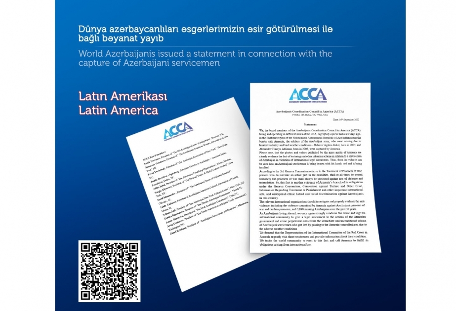 Diasporla İş üzrə Dövlət Komitəsindən bildiriblər ki, Amerika Azərbaycanlılarının Koordinasiya Şurasının adından beynəlxalq təşkilatlara ünvanlanmış bəyanatda Azərbaycan Ordusunun əsgərləri – 2004-cü il təvəllüdlü Bəbirov Aqşin Qabil oğlu və 2003-cü il təvəllüdlü Axundov Hüseyn Əhliman oğlunun əsir düşməsinin səbəbləri haqqında informasiya təqdim olunub. Həmçinin Azərbaycan hərbi qulluqçularına qarşı insanlığa zidd hərəkətlər diqqətə çatdırılıb, bu zorakılıq aktının Ermənistan tərəfindən beynəlxalq humanitar qanunların kobudcasına pozulması olduğu vurğulanıb.
