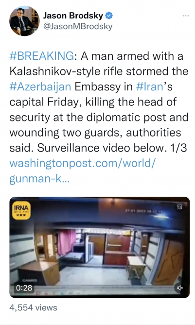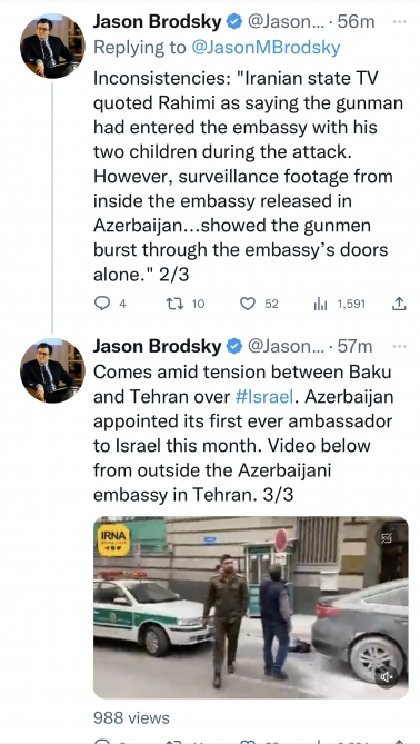 Amerikalı analitik, İranın nüvə proqramı üzrə ixtisaslaşan UANI (“Birlikdə nüvə İranına qarşı”) təsisatının rəhbəri Ceyson Brodski özünün tviter səhifəsində Azərbaycanın İrandakı səfirliyinə silahlı hücum barədə məlumat və müşahidə kameralarından videokadrlar yerləşdirib.