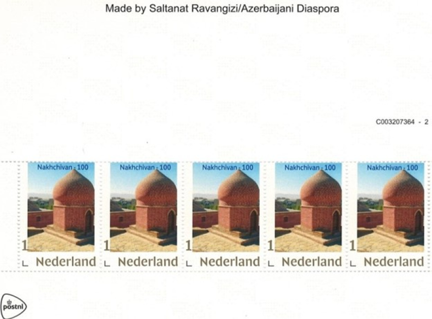 “Naxçıvan Muxtar Respublikasının 100 illik yubileyinin qeyd edilməsi haqqında” Azərbaycan Respublikası Prezidentinin 2023-cü il 30 dekabr tarixli Sərəncamının icrası məqsədilə Niderland Krallığının Amsterdam şəhərində Naxçıvan Muxtar Respublikasının 100 illik yubileyinə həsr olunan poçt markaları çap edilib.