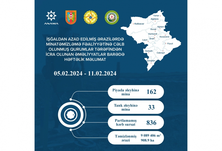 ANAMA-dan bildiriblər ki, fevralın 5-dən 11-dək Tərtər, Ağdərə, Kəlbəcər, Ağdam, Xocalı, Xankəndi, Xocavənd, Laçın, Şuşa, Füzuli, Qubadlı, Cəbrayıl və Zəngilanda piyada əleyhinə 162, tank əleyhinə 33 mina və 836 partlamamış hərbi sursat aşkarlanıb.