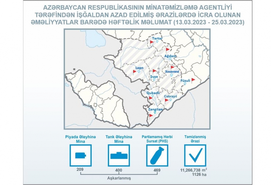 ANAMA-dan bildiriblər ki, martın 13-dən 25-dək Tərtər, Ağdam, Xocavənd, Laçın, Füzuli, Şuşa, Qubadlı, Cəbrayıl və Zəngilan rayonlarının ərazilərində aparılmış minatəmizləmə əməliyyatları zamanı piyada əleyhinə 209 mina, tank əleyhinə 400 mina və 469 ədəd partlamamış hərbi sursat aşkarlanaraq zərərsizləşdirilib.