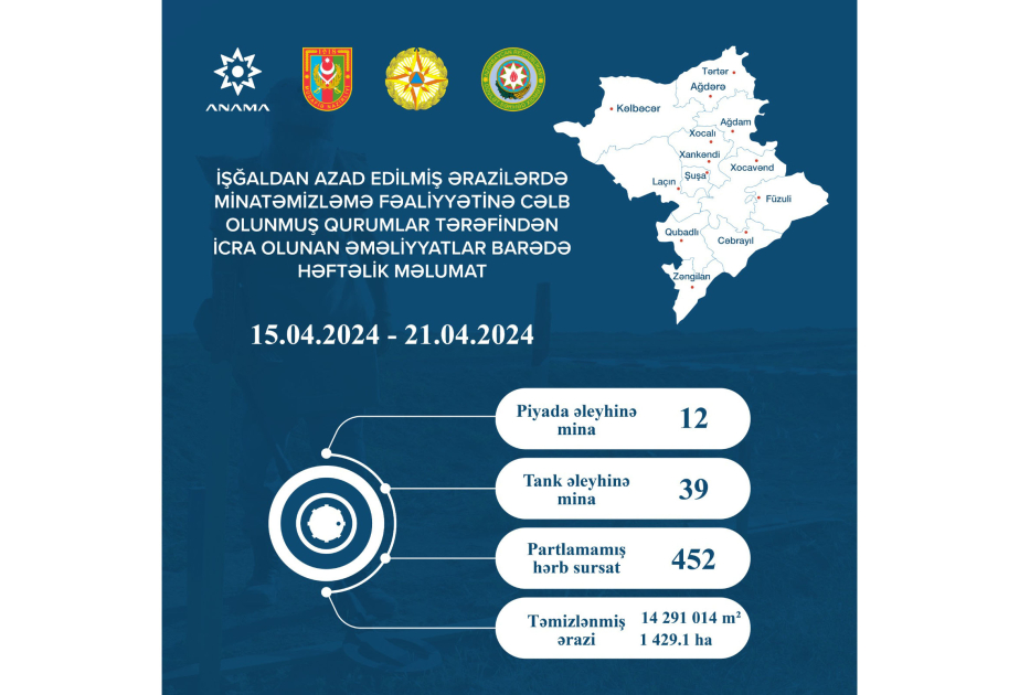 ANAMA-dan bildirilib ki, aprelin 15-dən 21-dək Tərtər, Ağdərə, Kəlbəcər, Ağdam, Xocalı, Xankəndi, Xocavənd, Laçın, Şuşa, Füzuli, Qubadlı, Cəbrayıl və Zəngilan ərazilərində aparılmış minatəmizləmə əməliyyatları zamanı piyada əleyhinə 12, tank əleyhinə 39 mina və 452 partlamamış hərbi sursat aşkarlanaraq zərərsizləşdirilib.