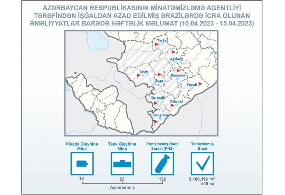 ANAMA-dan bildiriblər ki, aprelin 10-dən 15-dək Tərtər, Ağdam, Xocavənd, Laçın, Füzuli, Şuşa, Qubadlı, Cəbrayıl və Zəngilan rayonlarının ərazilərində aparılmış minatəmizləmə əməliyyatları zamanı piyada əleyhinə 18, tank əleyhinə 23 mina və 132 ədəd partlamamış hərbi sursat aşkarlanaraq zərərsizləşdirilib.