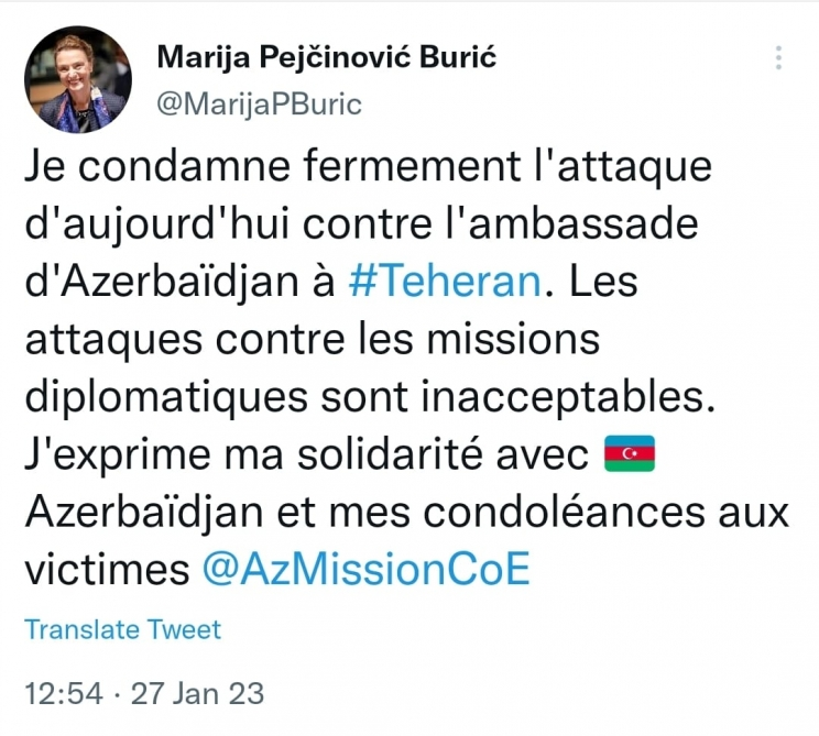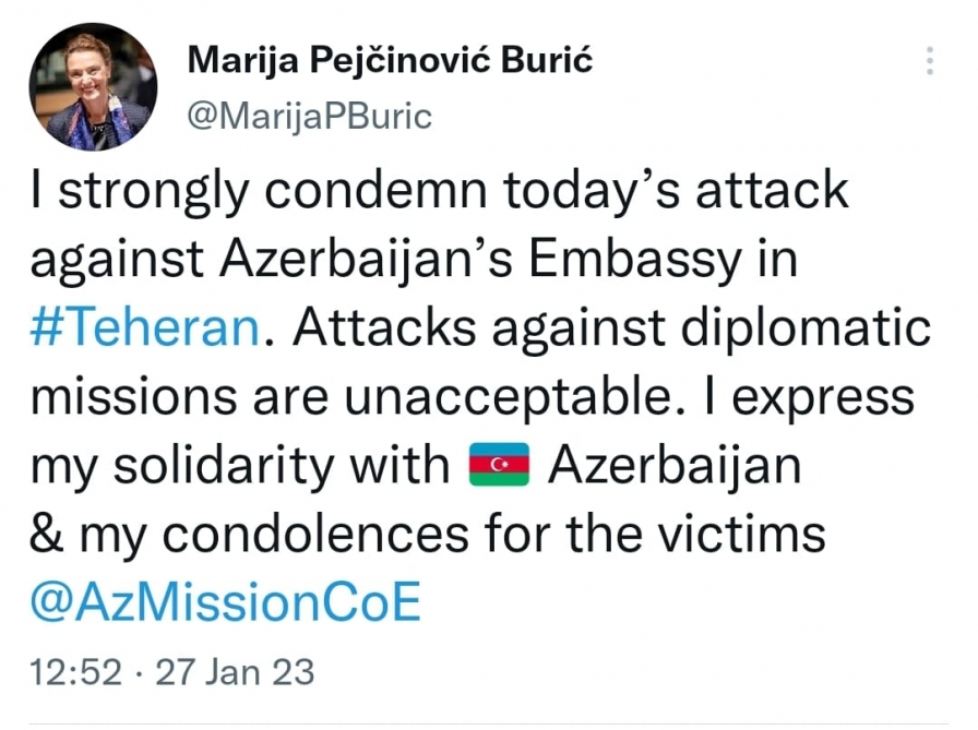 Avropa Şurasının (AŞ) Baş katibi Mariya Peçinoviç Buriç Azərbaycanın Tehrandakı səfirliyinə silahlı hücumu pisləyib