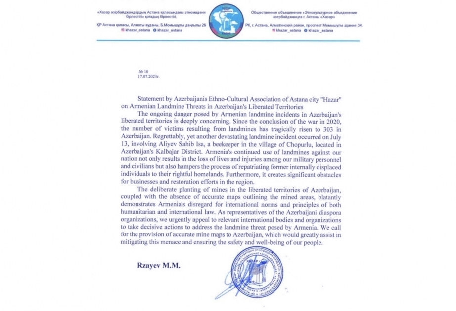 Qazaxıstanın paytaxtı Astanada fəaliyyət göstərən “Xəzər” Azərbaycan Etnomədəni Birliyi Ermənistanın ölkəmizin işğaldan azad olunmuş ərazilərində mina təhlükəsi yaratması ilə bağlı beynəlxalq ictimaiyyətə müraciət edib.