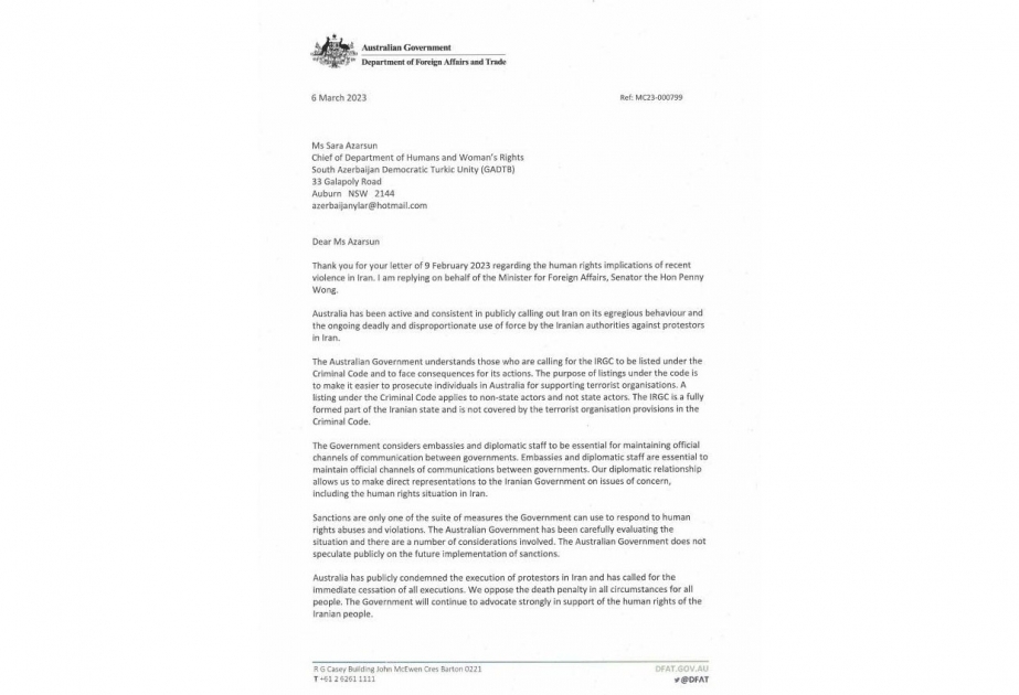Diasporla İş üzrə Dövlət Komitəsindən verilən məlumata görə, Güney Azərbaycan Demokratik Türk Birliyinin İnsan və qadın hüquqları şöbəsinin müdiri Sara Azərsuna xarici işlər naziri, senator Penni Vonqun adından hökumətin Xarici işlər və ticarət departamentinin ünvanladığı məktubda bildirilib ki, Avstraliya qəzəbləndirici davranışına və etirazçılara qarşı davam edən ölümcül və qeyri-mütənasib güc tətbiqinə görə açıq olaraq İran rejimini fəal və ardıcıl şəkildə pisləyib.
