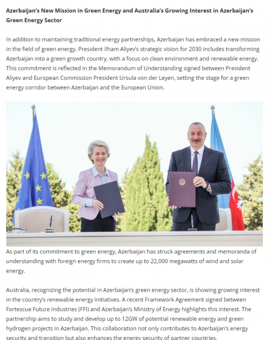 Bu xüsusda, Avstraliyanın Azərbaycanın yaşıl enerji sektorundakı potensialını tanıyaraq, ölkənin bərpaolunan enerji təşəbbüslərinə artan marağından və bir müddət əvvəl “Fortescue Future Industries” (FFI) ilə Azərbaycanın Energetika Nazirliyi arasında imzalanmış Çərçivə Sazişinə toxunularaq əməkdaşlıq perspektivlərindən bəhs edilir.
