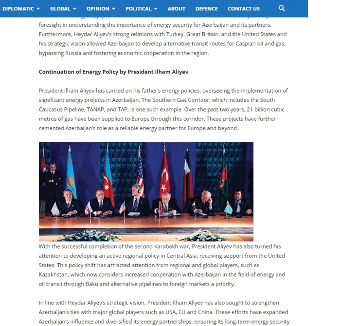 Məqalədə Ulu Öndər Heydər Əliyev irsinin Prezident İlham Əliyevin davamlı səyləri, ölkənin ənənəvi neft və qaz təchizatçısından yaşıl enerji sahəsində liderə çevrilməsi ilə yaşamasından da danışılır.