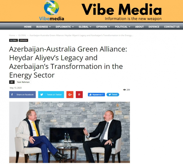 Azərbaycanın Avstraliya İttifaqındakı səfirliyinin dəstəyi ilə bu ölkənin geniş oxucu kütləsinə malik “Vibe Media” xəbər portalında Ümummilli Lider Heydər Əliyevin anadan olmasının 100 illiyi ilə bağlı “Heydər Əliyev irsi və Azərbaycanın enerji sektorunda transformasiyası” sərlövhəli məqalə dərc olunub.