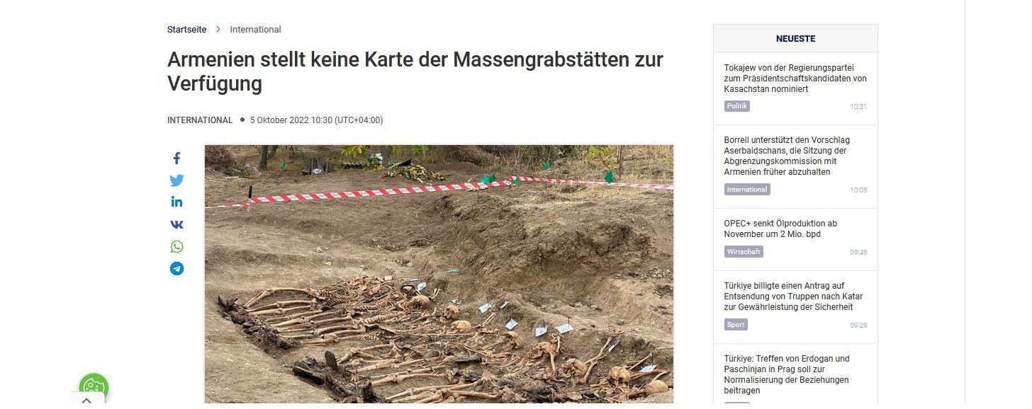 Avstriyanın dasfazit.at onlayn qəzetində “Ermənistan kütləvi məzarlıq yerlərinin xəritələrini vermir” adlı məqalə dərc olunub.