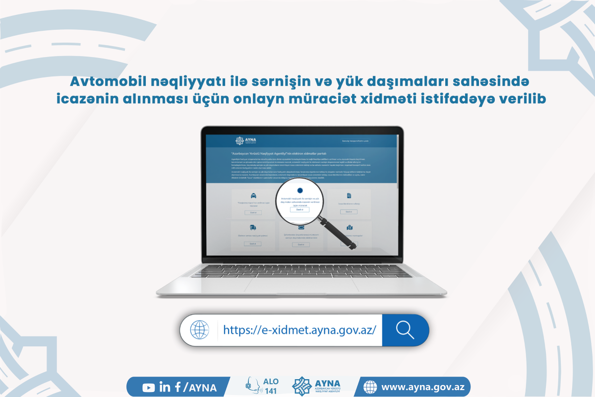Elektron xidmətlərdən https://e-xidmet.ayna.gov.az/ portalına daxil olaraq yararlanmaq mümkündür. Linkə daxil olaraq avtomobil nəqliyyatı ilə sərnişin və yük daşımaları sahəsində icazənin verilməsi üçün müraciət bölməsini seçmək lazımdır. Müraciət edən şəxsin elektron kabinetinə yalnız “ASAN Login” üzərindən elektron imza vasitələrindən biri