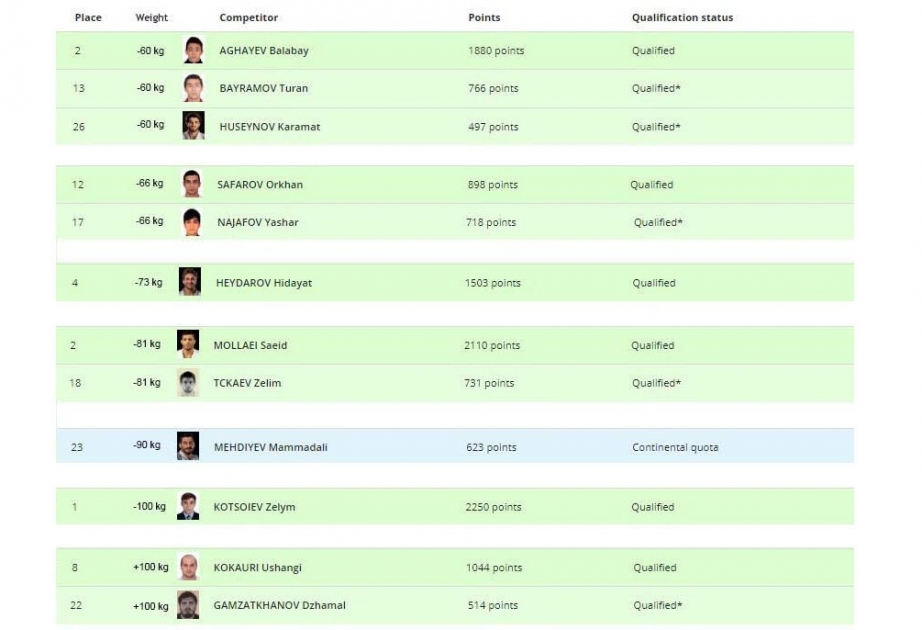 Olimpiya reytinq cədvəlinə əsasən Zelim Kotsoyev (100 kq) ilk sırada yer alıb. Balabəy Ağayev (60 kq) və Səid Mollayi (81 kq) ikinci yerdə qərarlaşıb. Hidayət Heydərov (73 kq) dördüncü pillədədir.