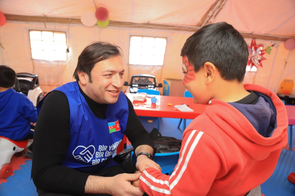 Zəlzələdən ən çox təsirlənənlərin uşaqlar olduğunu nəzərə alaraq, azərbaycanlı könüllülər uşaqları daima diqqətdə saxlayır, türkiyəli həmkarları ilə birlikdə onların inkişafı üçün müxtəlif fəaliyyətlər həyata keçirirlər. Belə ki, gənclərimiz üç həftədir fəlakətdən zərər görmüş Kahramanmaraş, Hatay, Adıyaman və Malatya bölgələrindəki çadır şəhərciklərində yaşayan həssas vəziyyətdəki uşaqlara xidməti davam etdirir. Könüllülərimiz zərərçəkmiş uşaqların reabilitasiyası və asudə vaxtının səmərəli təşkili məqsədilə xüsusi çadırlar quraşdırır, habelə təbii fəlakət zamanı keçirdikləri sarsıntıları, yaşadıqları travmaları minimuma endirmək üçün uşaqlara qayğı və psixoloji dəstək xidməti göstərir, eləcə də uşaqların asudə vaxtının səmərəli təşkili məqsədilə müxtəlif oyunlar və digər əyləncəli-maarifləndirici fəaliyyətlər təşkil edirlər. Həmçinin gənclərimiz tərəfindən “uşaq və ana mərkəzi” kimi fəaliyyət göstərən çadırlar qurulur və bu mərkəzdə uşaqlara və analarına xidmət göstərməklə yanaşı, uşaqlara kino və cizgi filmlərinin göstərilməsi üçün də şərait yaradılır.