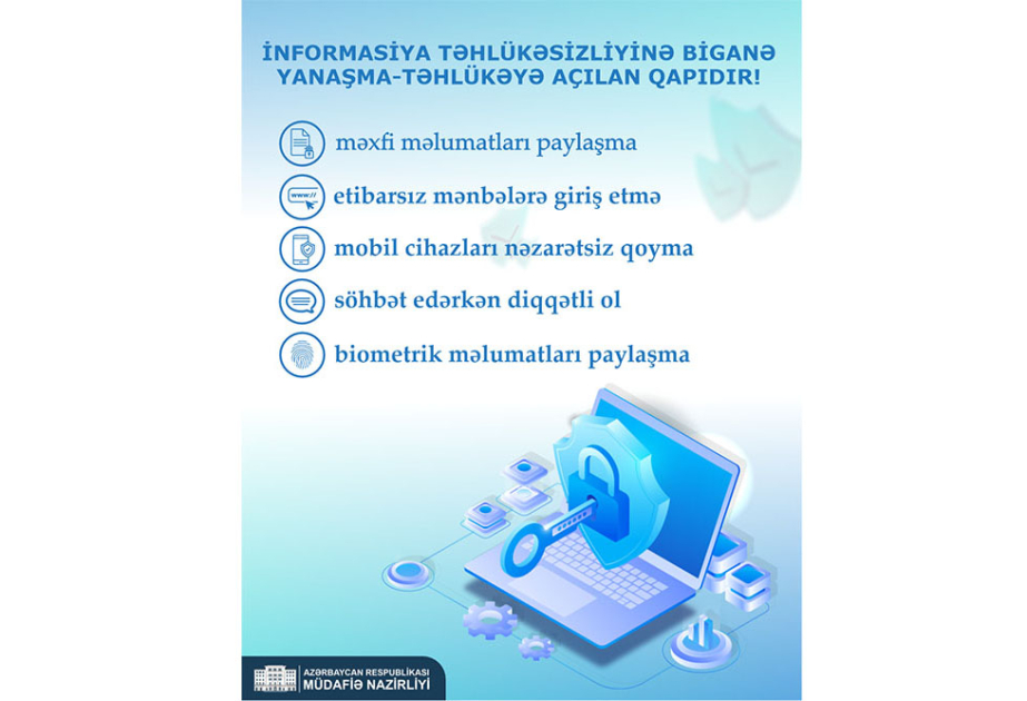Nazirliyin mətbuat xidmətindən verilən məlumata görə, il ərzində Azərbaycan Ordusunda kibertəhlükəsizlik, dövlət sirrinin qorunması, rəqəmsal savadlılığın artırılması, eləcə də informasiya təhlükəsizliyinin təmin olunması məqsədilə Müdafiə Nazirliyinin baş idarə, idarə və xidmətlərində, xüsusi təyinatlı təhsil müəssisələrində, həmçinin hərbi hissələrdə mütəmadi profilaktik tədbirlər keçirilir.