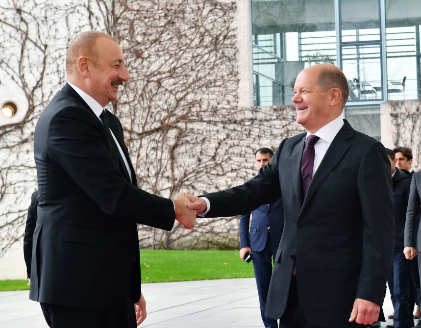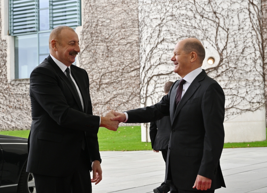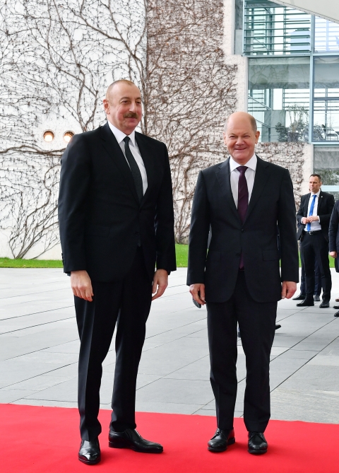 Almaniya Federativ Respublikasının Kansleri Olaf Şolts Azərbaycan Respublikasının Prezidenti İlham Əliyevi qarşılayıb.