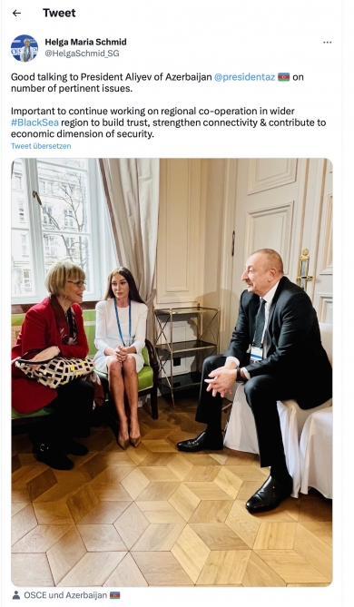 Məqalədə Prezident İlham Əliyevin Münxenə səfəri çərçivəsində ATƏT-in baş katibi Helqa Maria Şmid ilə də görüşündən bəhs olunub. Baş katibin bu görüş barədə tviter hesabında etdiyi paylaşımda bir sıra məsələlər ətrafında Azərbaycan Prezidenti ilə yaxşı söhbət apardığını, habelə etimadın yaradılması, bağlantıların gücləndirilməsi və iqtisadi sahədə təhlükəsizliyə töhfə vermək üçün Qara dəniz regionunda əməkdaşlıq istiqamətində fəaliyyətin vacibliyini vurğulaması qeyd edilib.